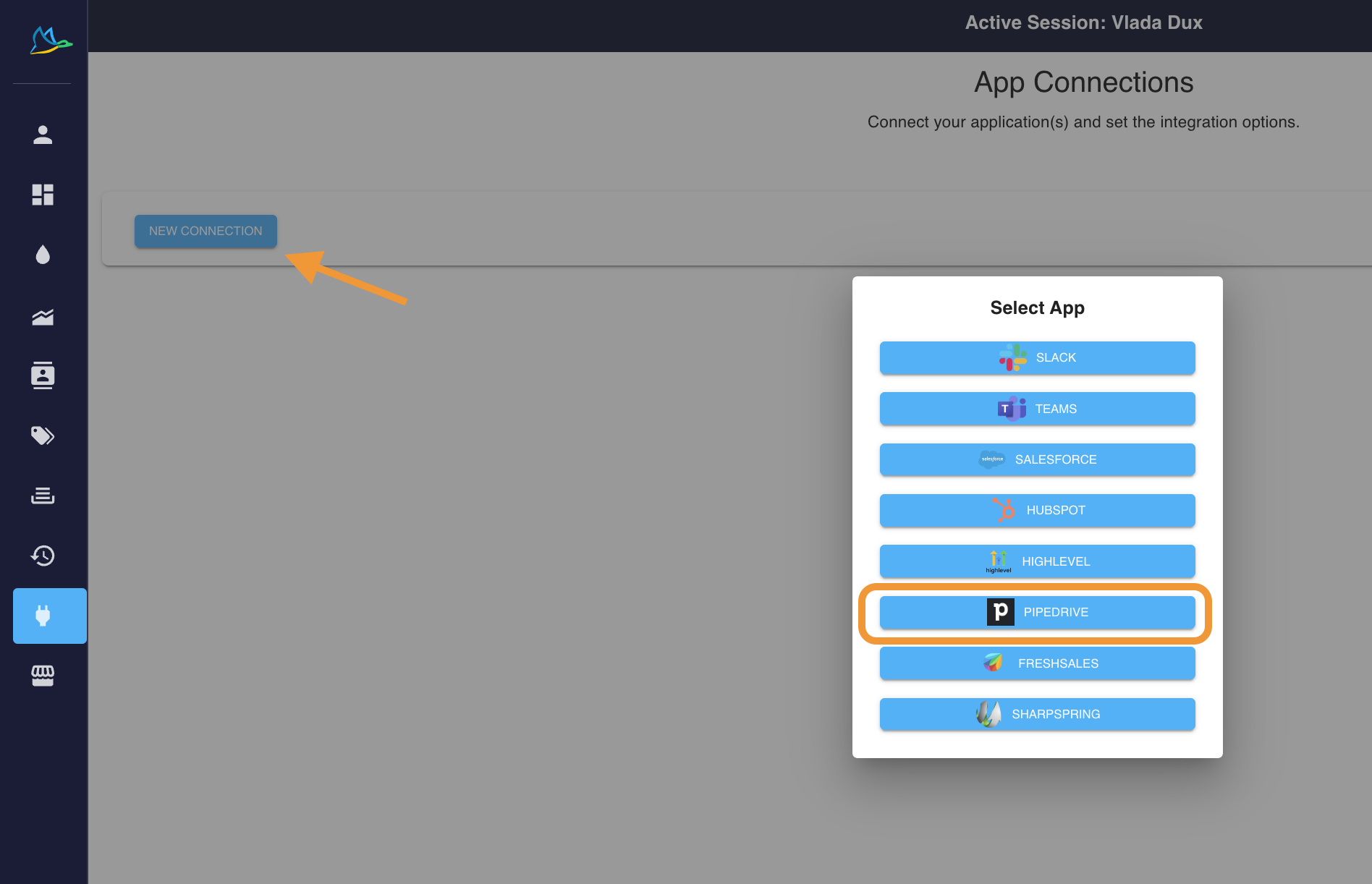 To install the Pipedrive CRM connector, go to Dux-Dash, CRM Connections page, click on the New Connection button and select Pipedrive: