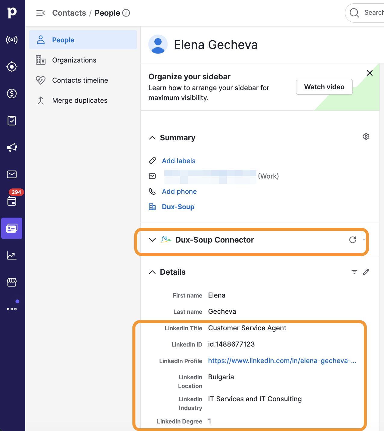 Now, when you open a contact in Pipedrive, the newly added fields and the Dux-Soup Connector panel will be visible.