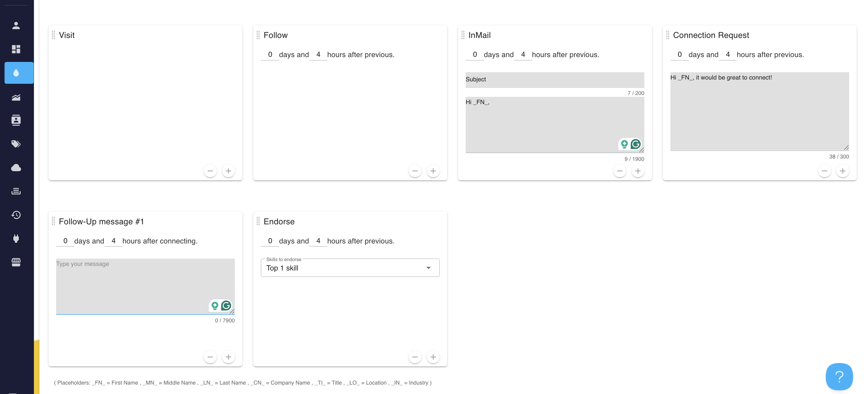 You can add the campaign action by clicking on a + button: visit, connection request, follow-up (direct message), endorse, follow, and InMail.