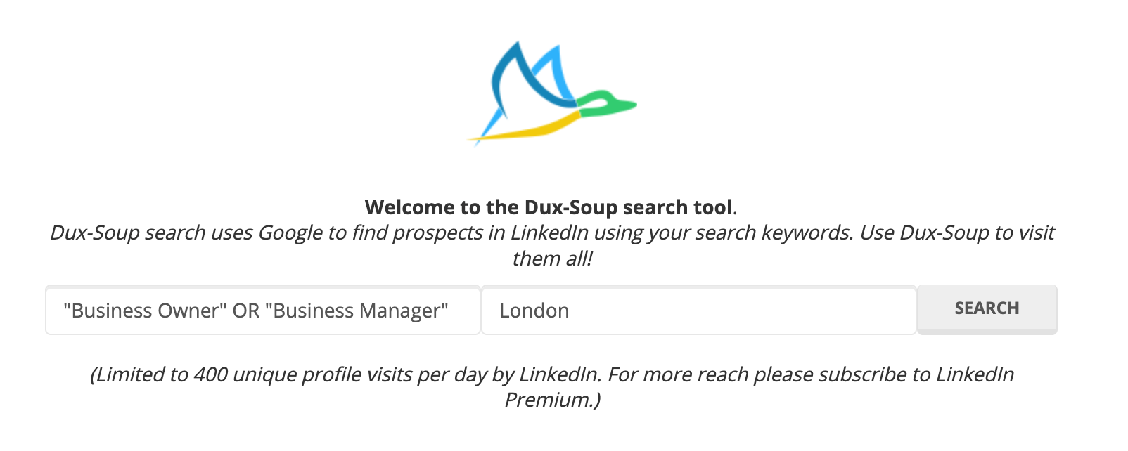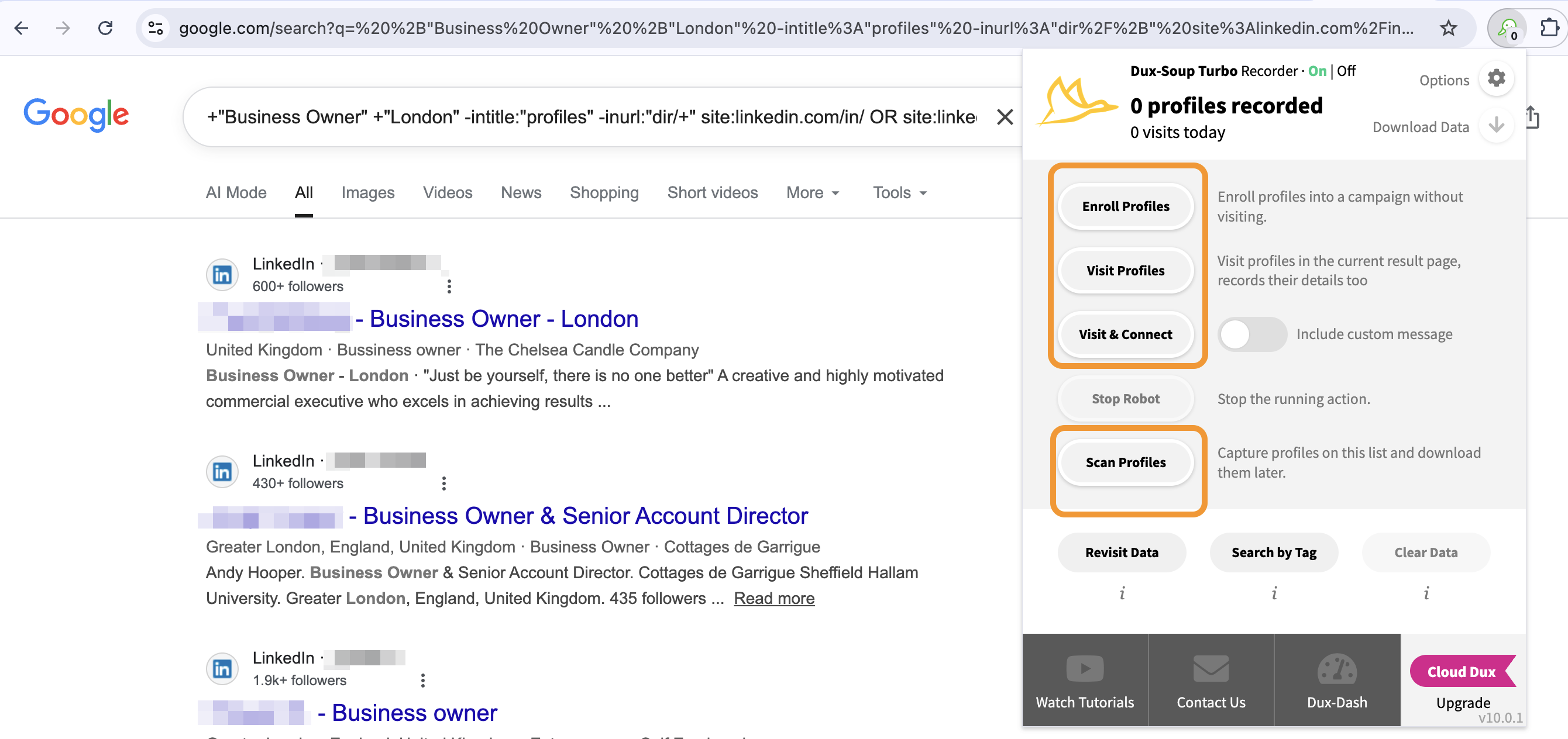 After clicking Search, you can run all available Dux-Soup actions by visiting profiles, scanning a list or enroll profiles on a campaign (Turbo only).