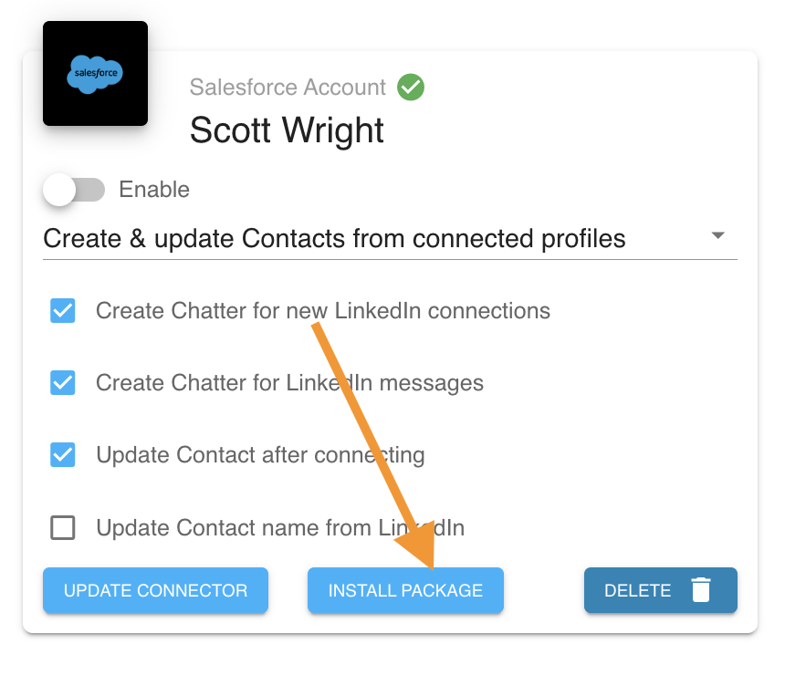 - Go to the CRM Connections page, select the Salesforce Connector, and click on the 'Install Package' button: