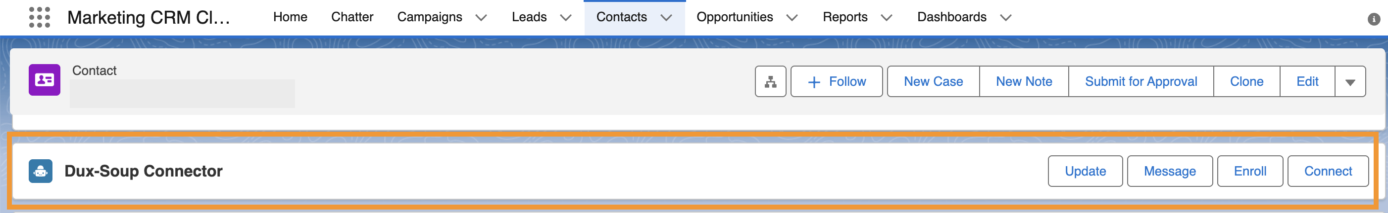 - Refresh the Contact page, and you should now see Dux-Soup actions available directly within the Contact record. These actions can be initiated by anyone who has access to the contact.