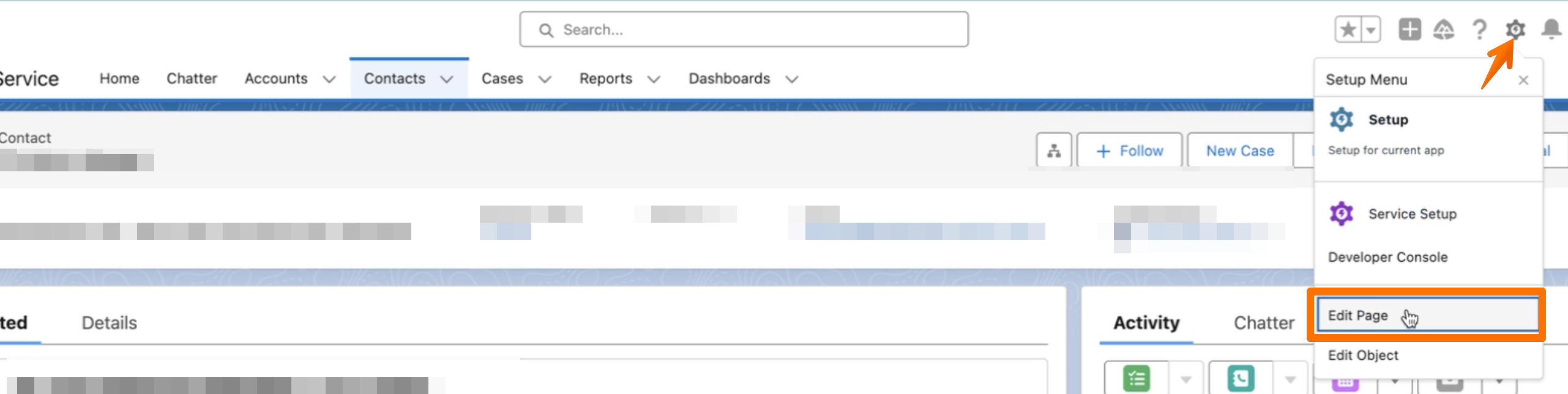 - Once installed, you can go to your Salesforce Contacts page and open any contact. Then, click on the Setup Menu gear icon and click the 'Edit Page' button: