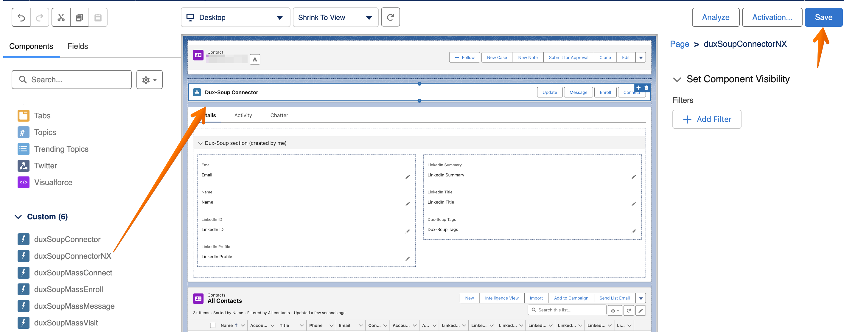 - Scroll down the menu on the left side and select the 'duxSoupConnectorNX' custom element. Then, drag it to the Contact page layout in the centre and save the changes. Non-Enterprise users should select the 'duxSoupConnector' element instead.