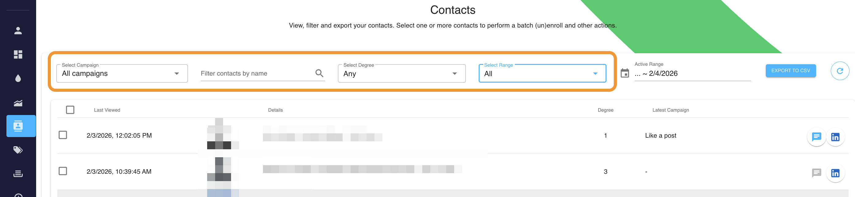 Within the Contacts page, you can view all recorded profiles or filter them using the following criteria: