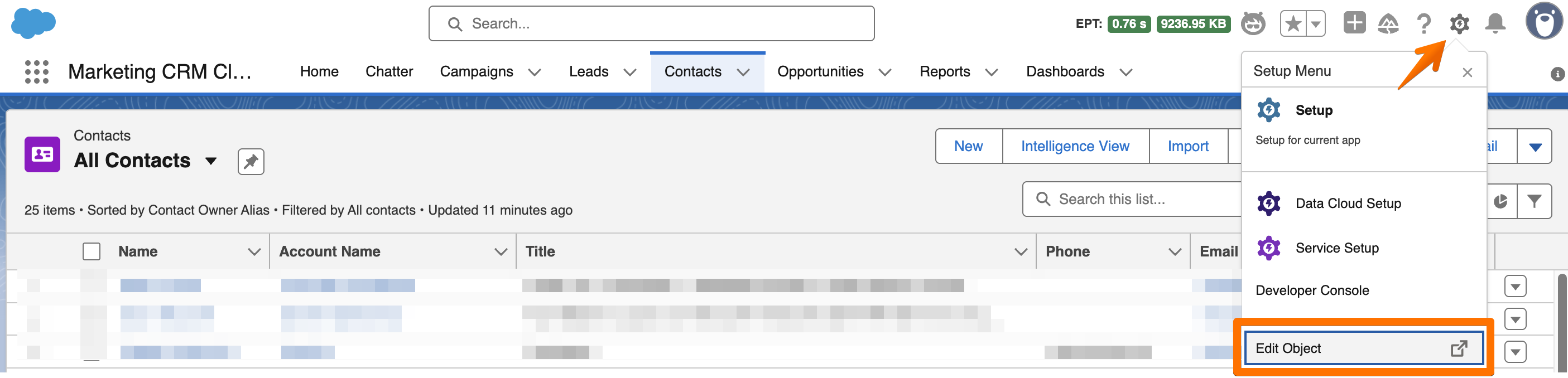 You can enable bulk Dux-Soup actions in the Salesforce Contacts list if you have Salesforce Enterprise Edition. To do that, click on the Setup Menu gear icon and select 'Edit Object':