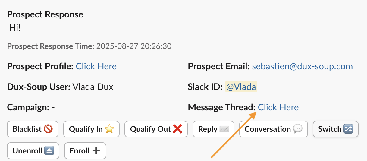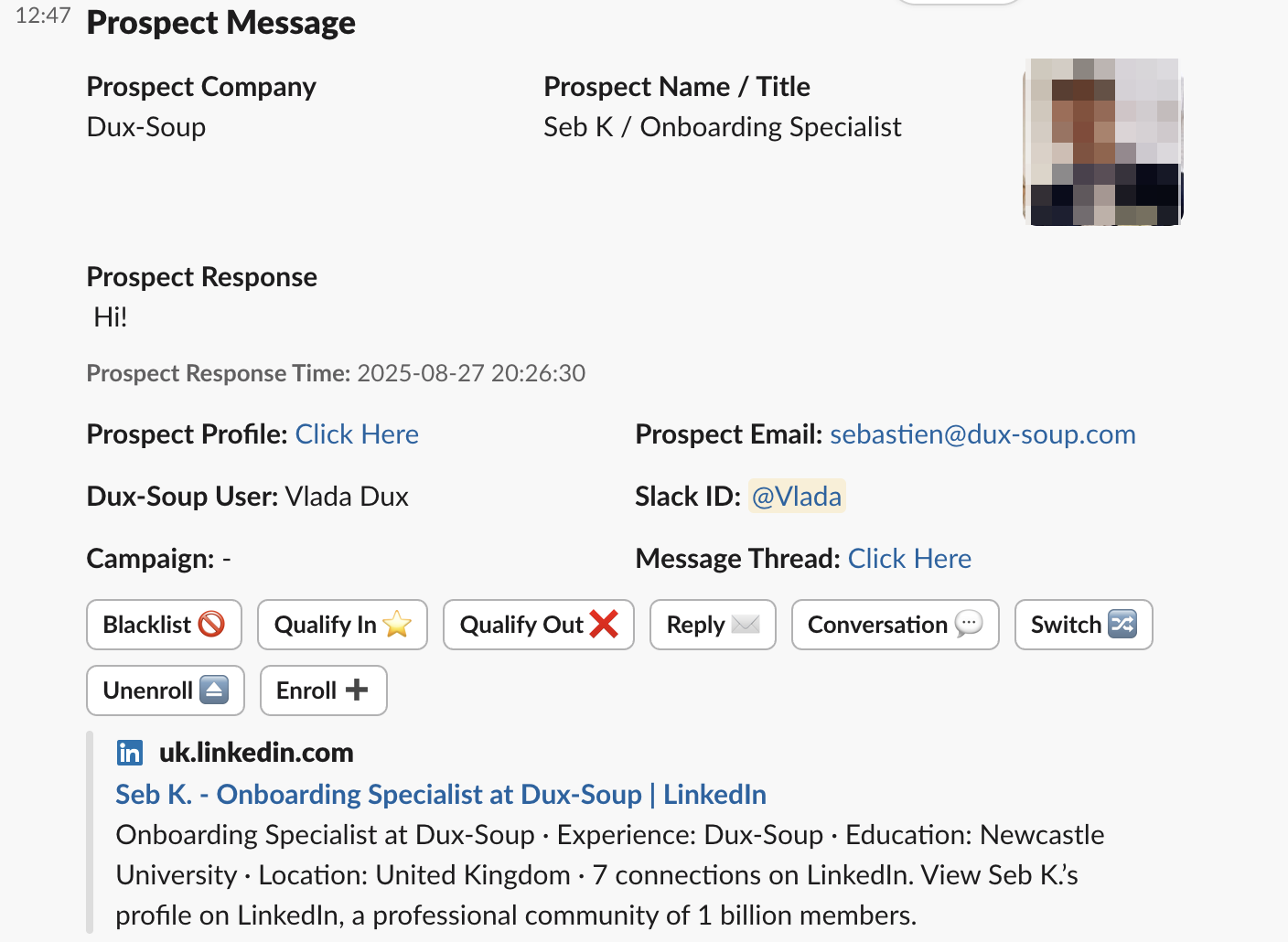 Dux-Soup’s Slack integration allows you to receive notifications in a selected Slack channel whenever a prospect replies to your LinkedIn outreach - once the integration is installed.