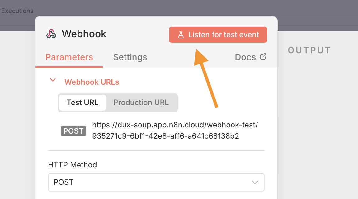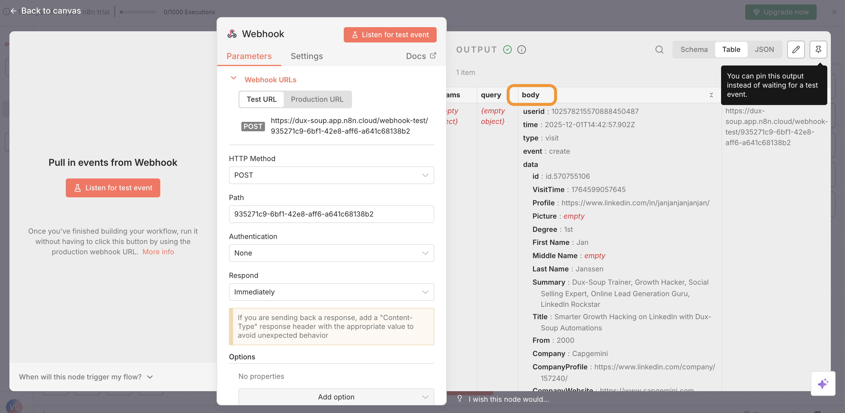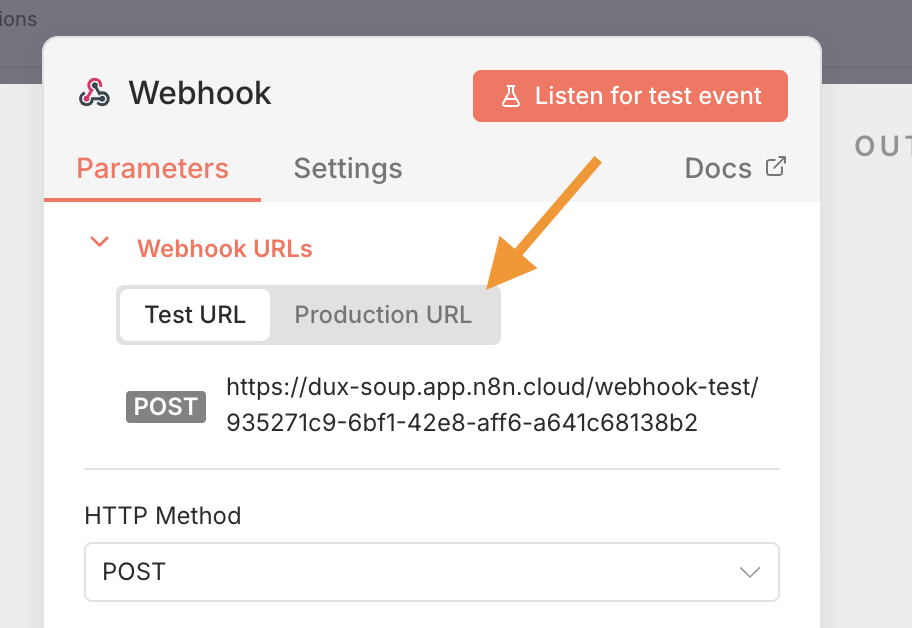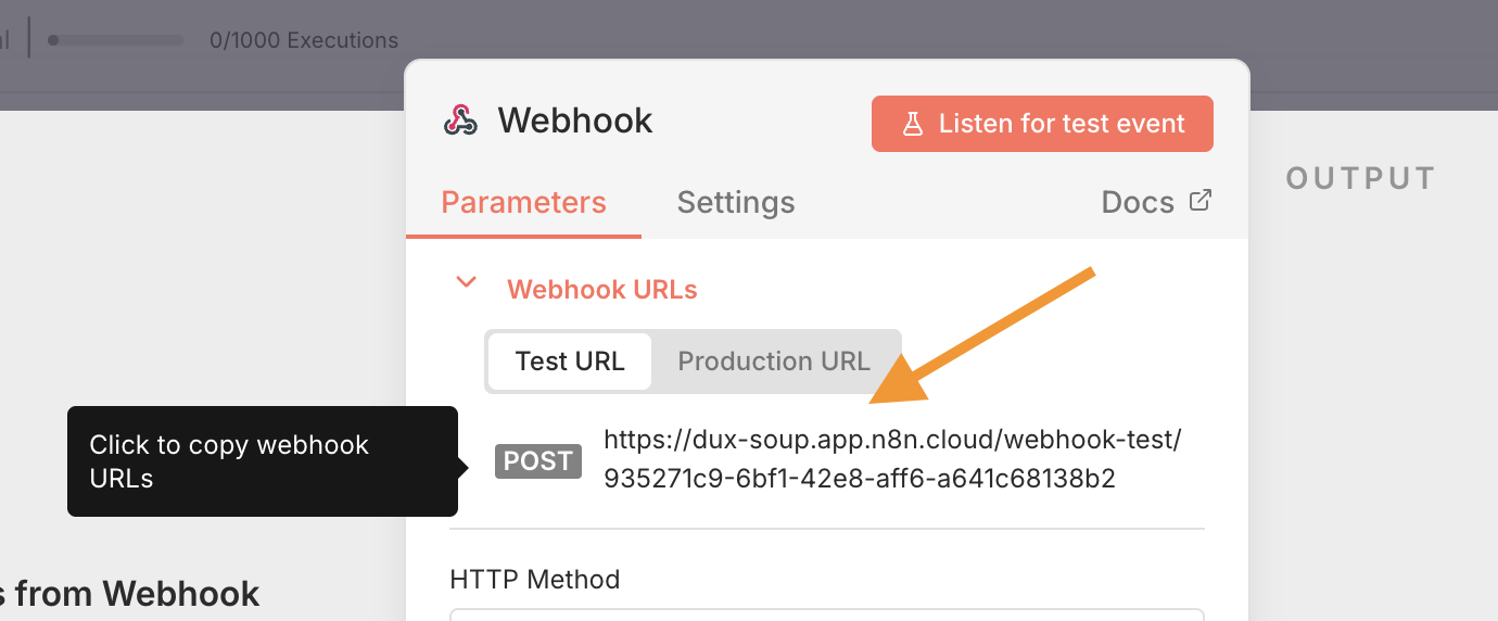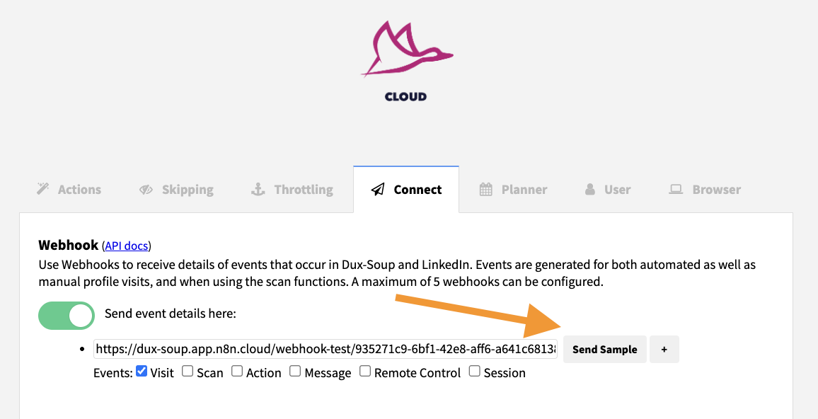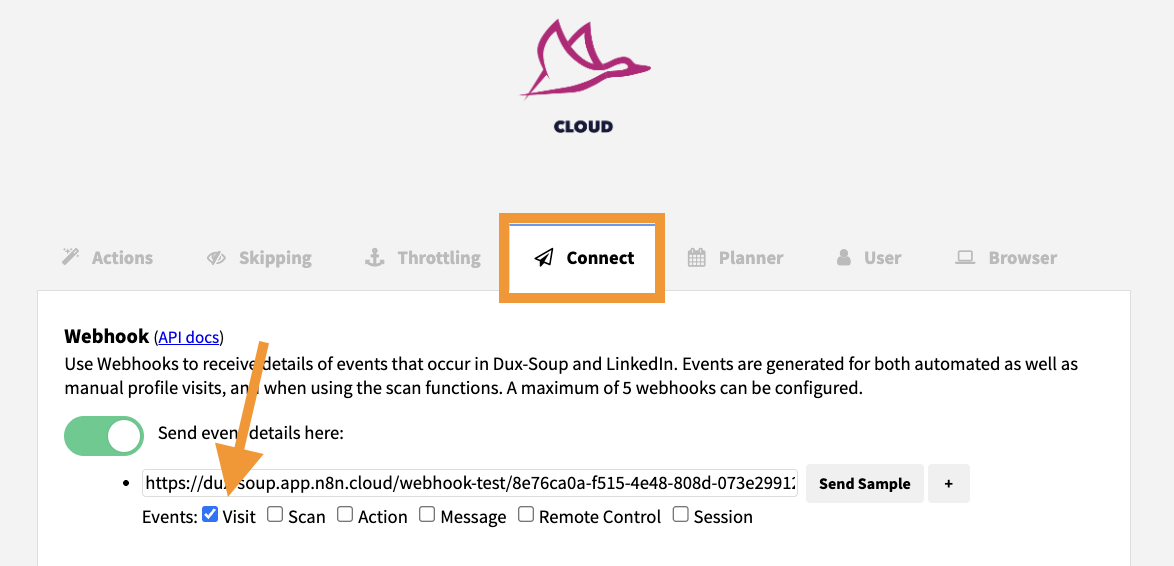 Paste it into Dux-Soup → Options → Connect → Webhook URL and enable the Visit event.