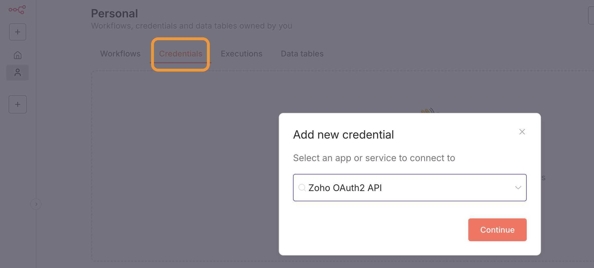 Choose the CRM node and set up Credentials to connect to CRM. In this example, we use Zoho CRM: