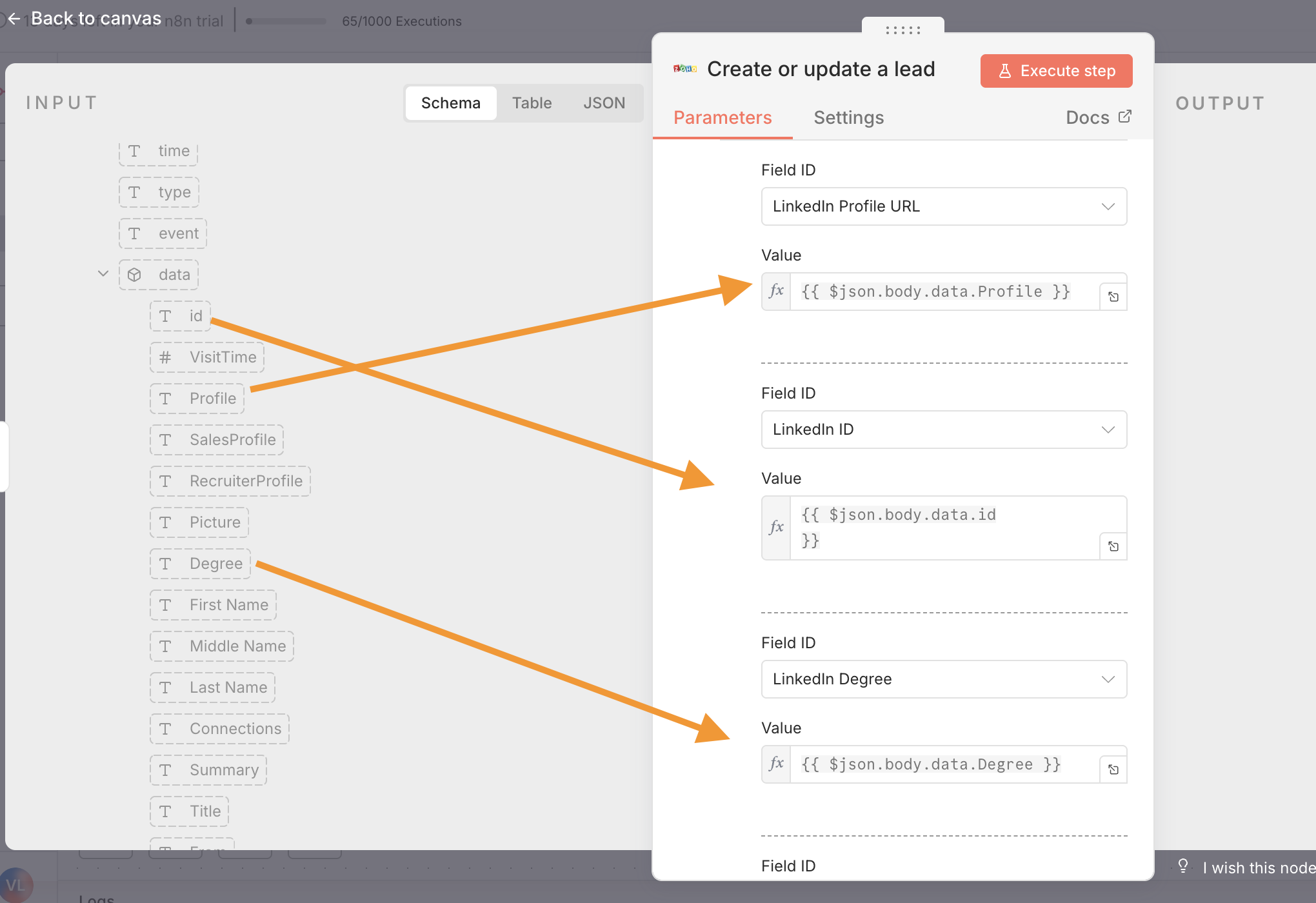 Suggested custom fields include: LinkedIn Profile URL, LinkedIn ID, LinkedIn Degree, and LinkedIn Title.