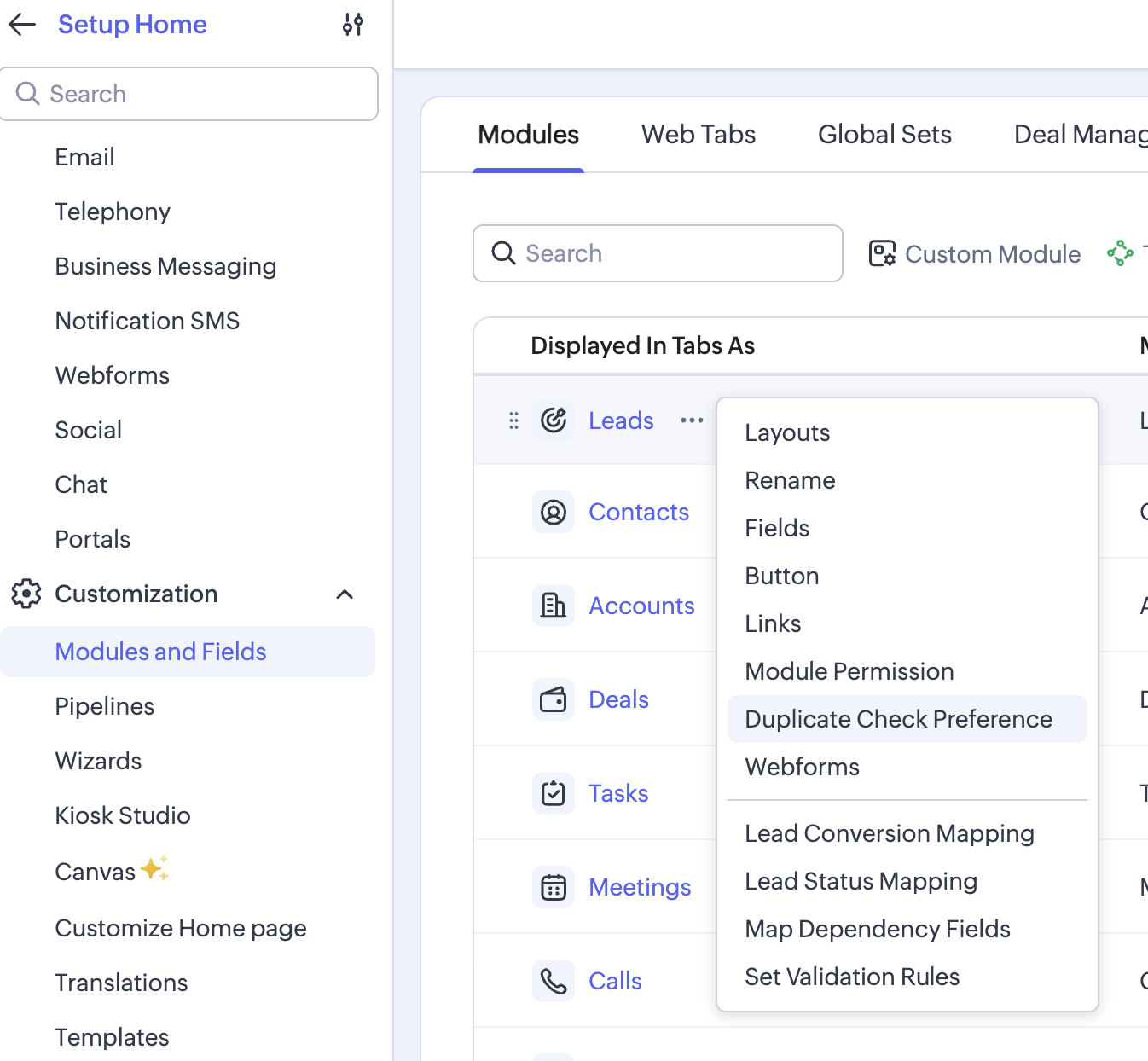 - Go back to Modules and Fields and click on the 3 dots next to the Leads module.