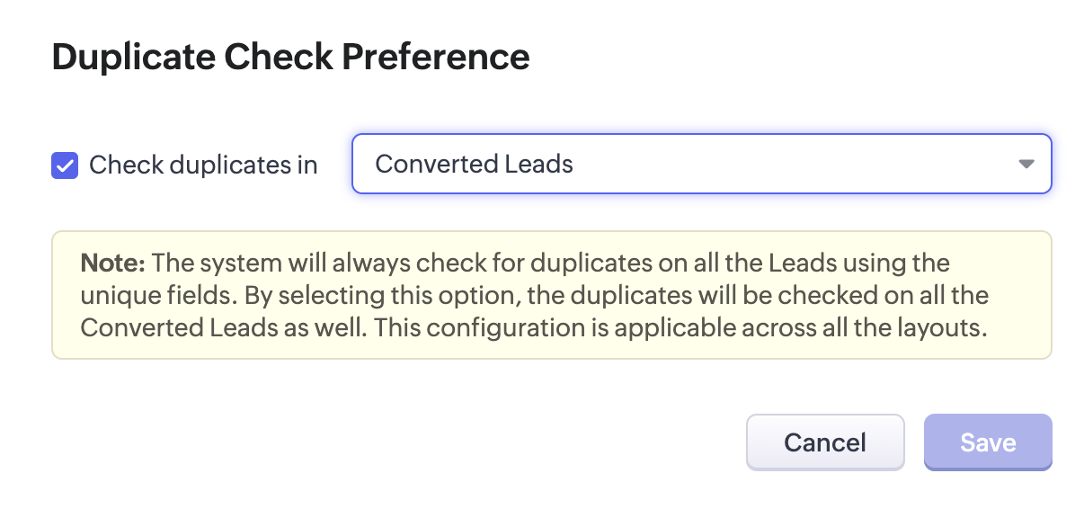 You can enable the Duplicate Check Preference option in the Zoho CRM to prevent duplicate lead records by following these steps: