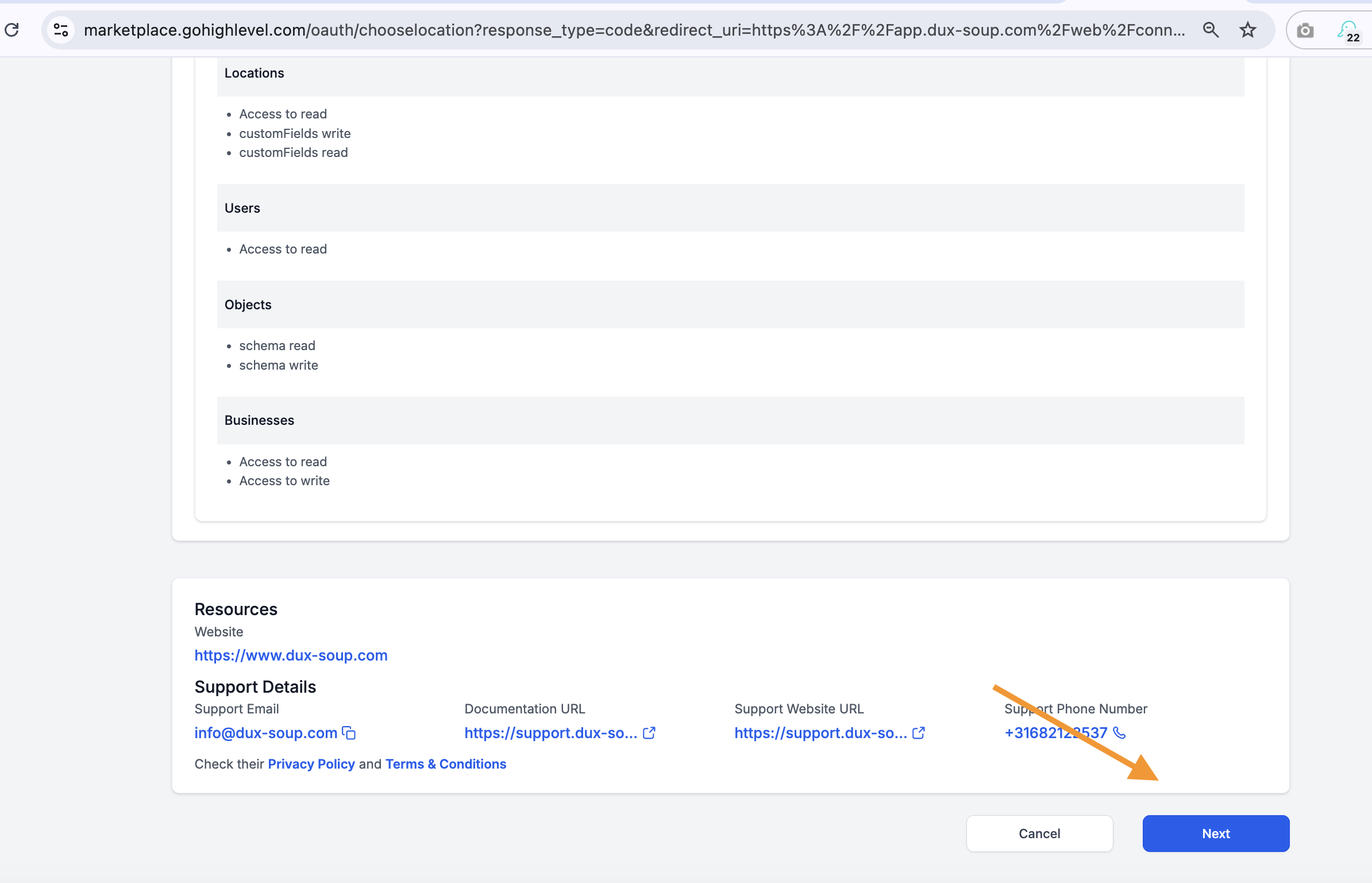 You will be prompted to log in to your GHL account. After logging in, you will be redirected to the Install Confirmation page. Here, you’ll see the permissions requested by the app - click Next at the bottom to continue.