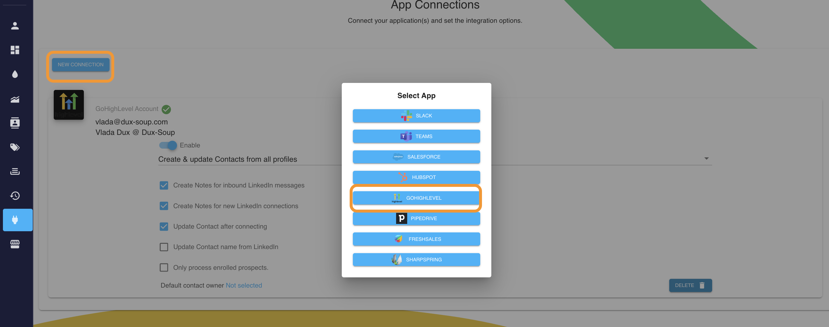 To install the Go High Level (GHL) CRM connector, open Dux-Dash and navigate to the App Connections page. Click the New Connection button and select GoHighLevel.