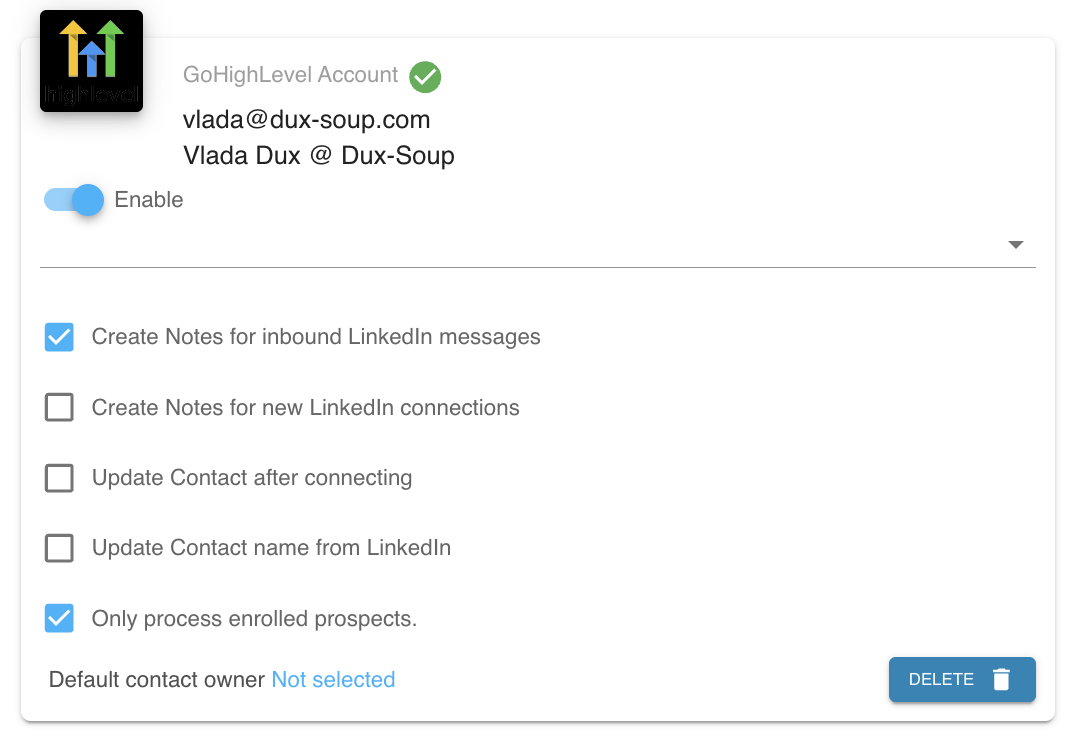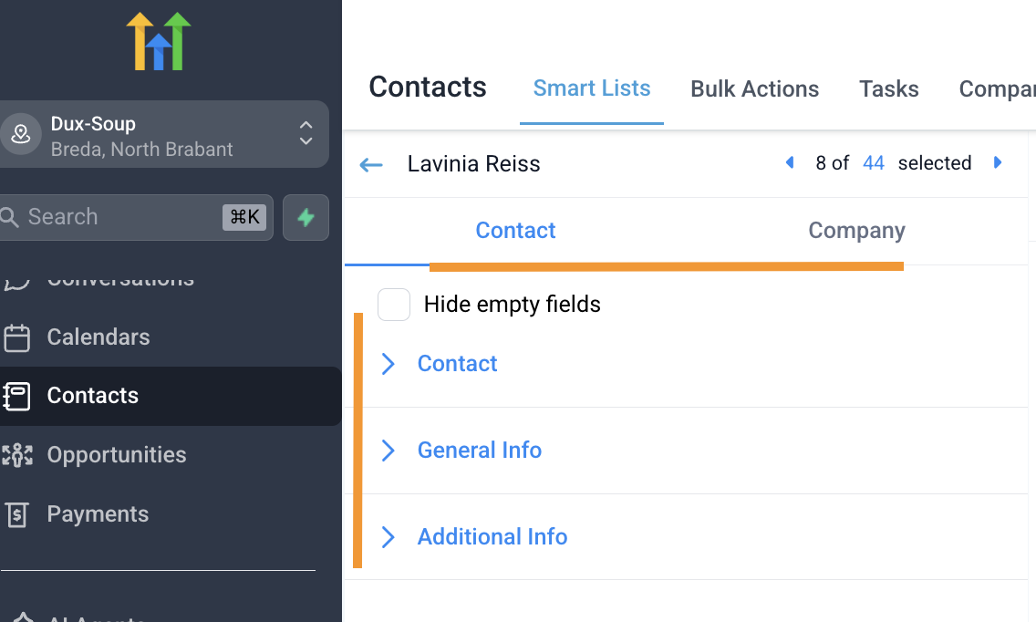 After installing and enabling the GHL CRM connector, Dux-Soup automatically creates Contact and Company records when you visit LinkedIn profiles (manually or via automation), based on your integration filter settings.