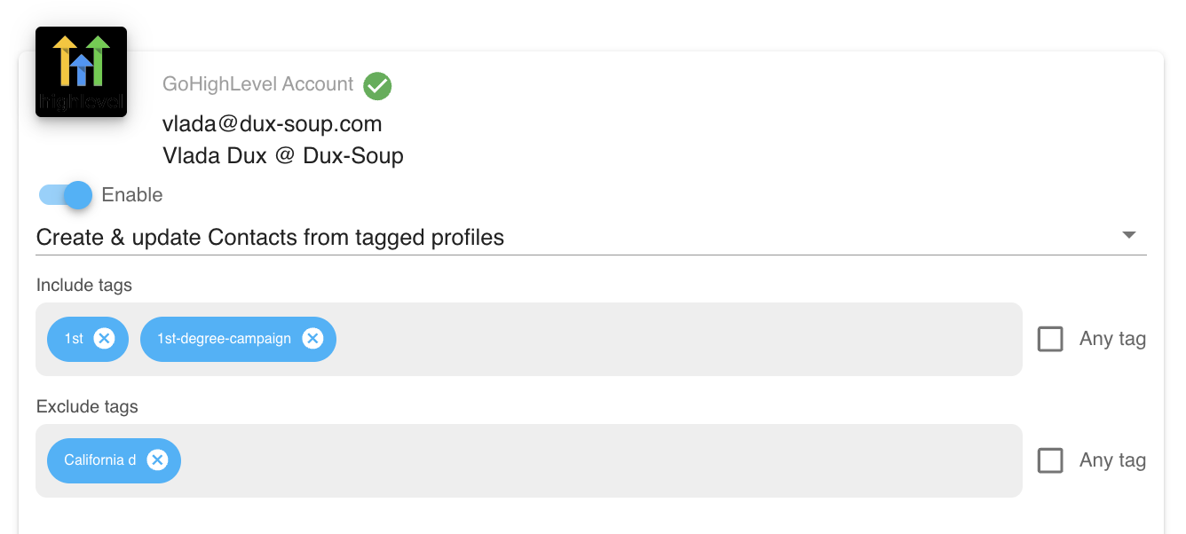 Choose which of your 1st-degree LinkedIn connections Dux-Soup should add or update in your CRM based on tags.