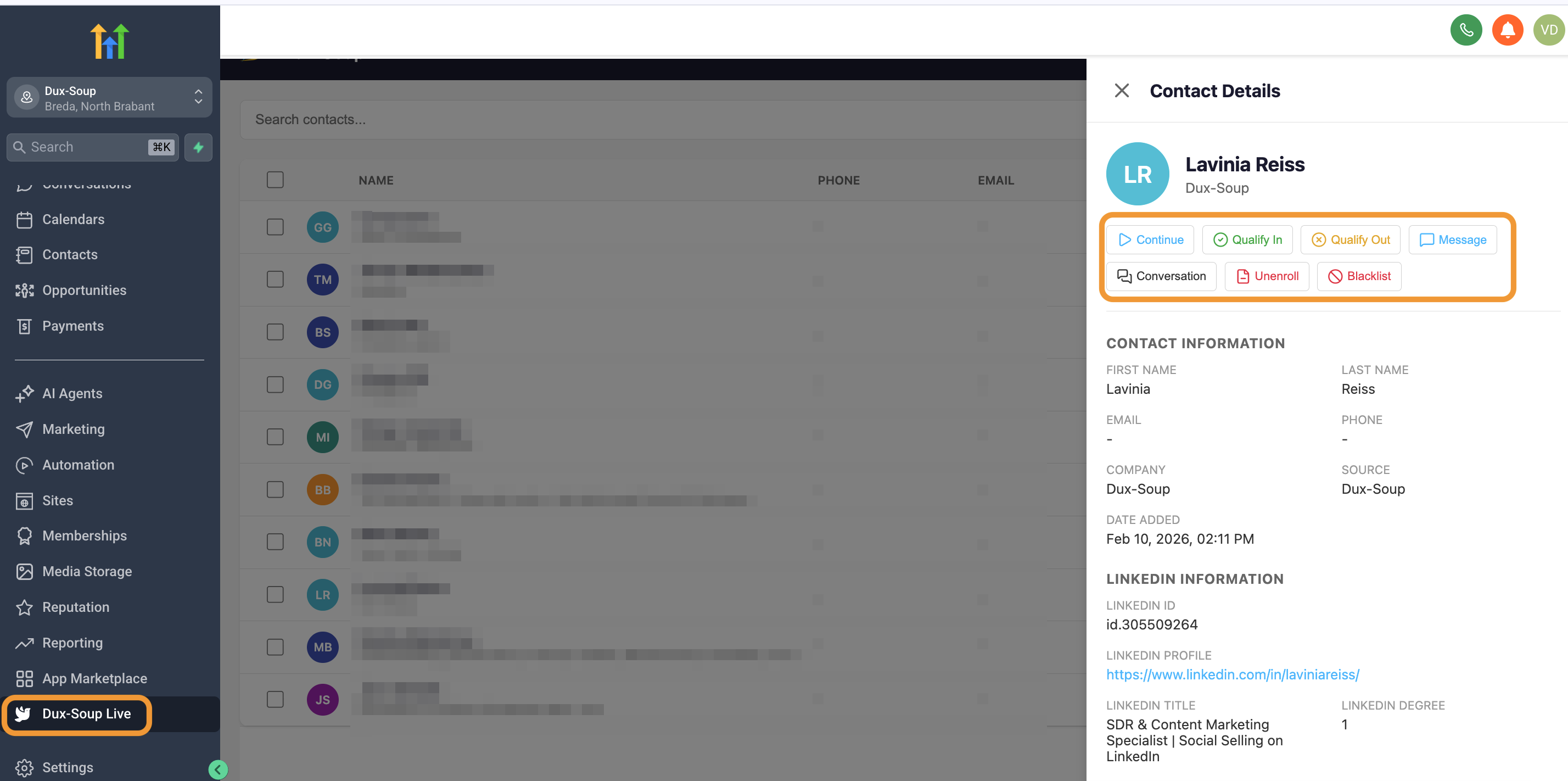 You can schedule Dux-Soup activities directly from your GHL CRM, including enrolling contacts in a Dux-Soup drip campaign, unenrolling them, qualifying them in or out of the campaign, continuing the campaign once they respond, and sending a direct message. You can also view LinkedIn conversation history and blacklist profiles for future automation from the Dux-Soup Live Contact page.