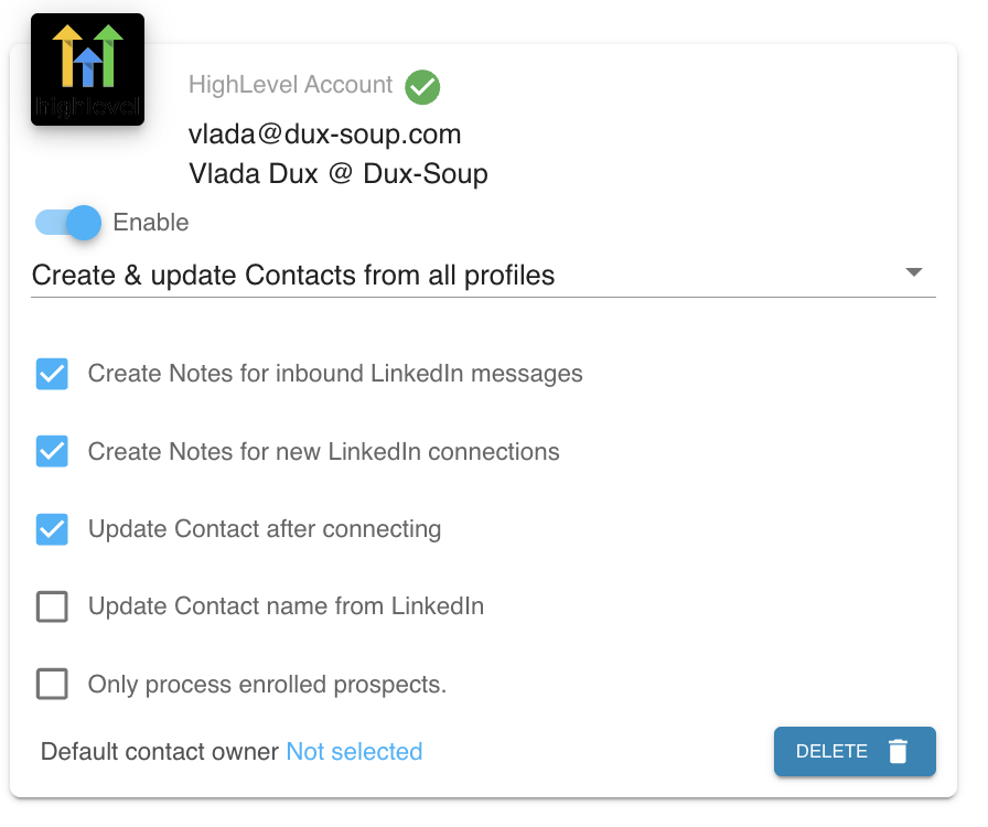 After installing and enabling the HighLevel CRM connector, Dux-Soup automatically creates Contact and Company records when you visit LinkedIn profiles (manually or via automation), based on your integration filter settings.