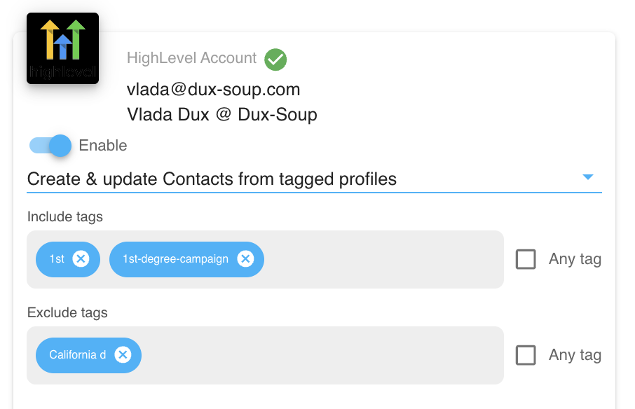 Choose which tagged LinkedIn profiles Dux-Soup should send to your CRM as new or updated contacts.