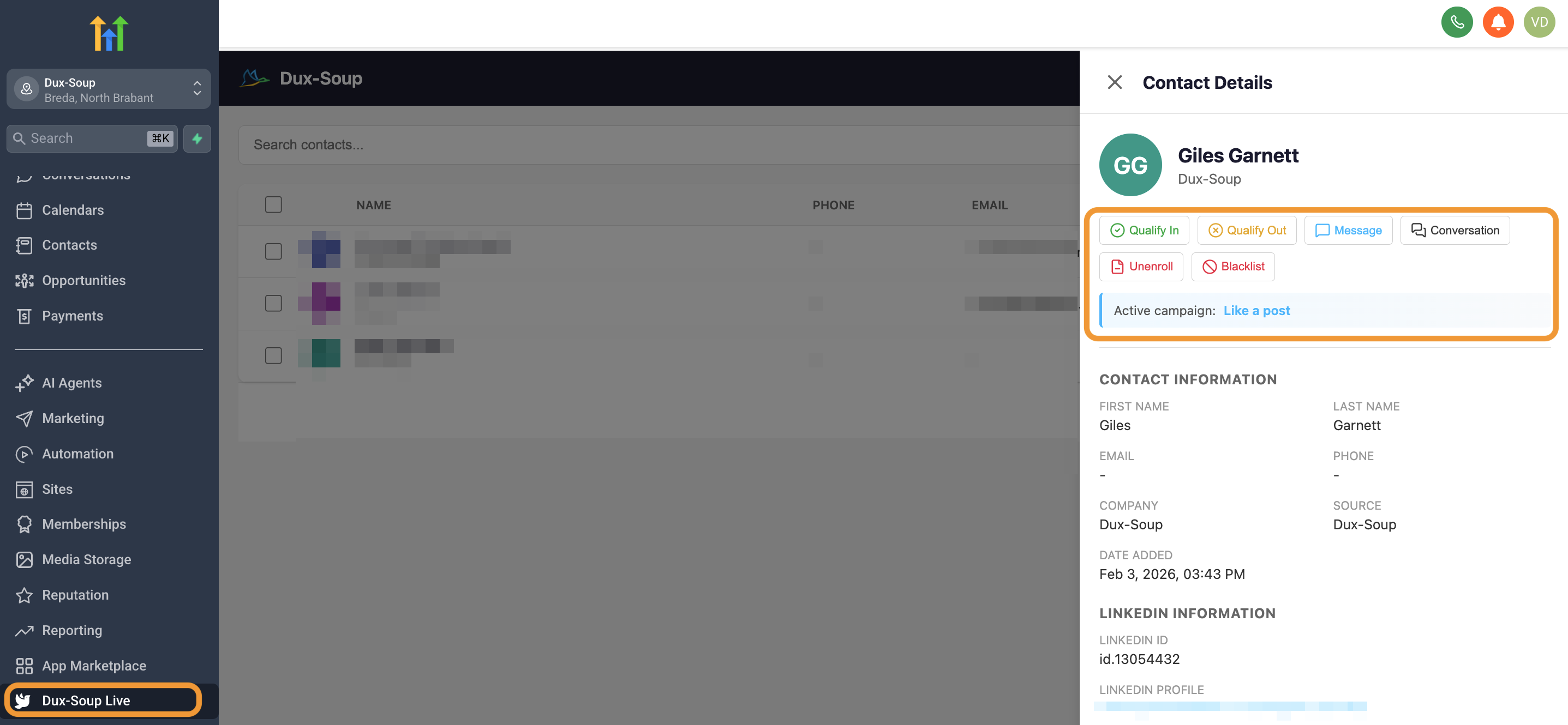 You can schedule Dux-Soup activities directly from your HighLevel CRM, including enrolling contacts in a Dux-Soup drip campaign, unenrolling them, qualifying them in or out of the campaign, continuing the campaign once they respond, and sending a direct message. You can also view LinkedIn conversation history and blacklist profiles for future automation from the Dux-Soup Live Contact page.