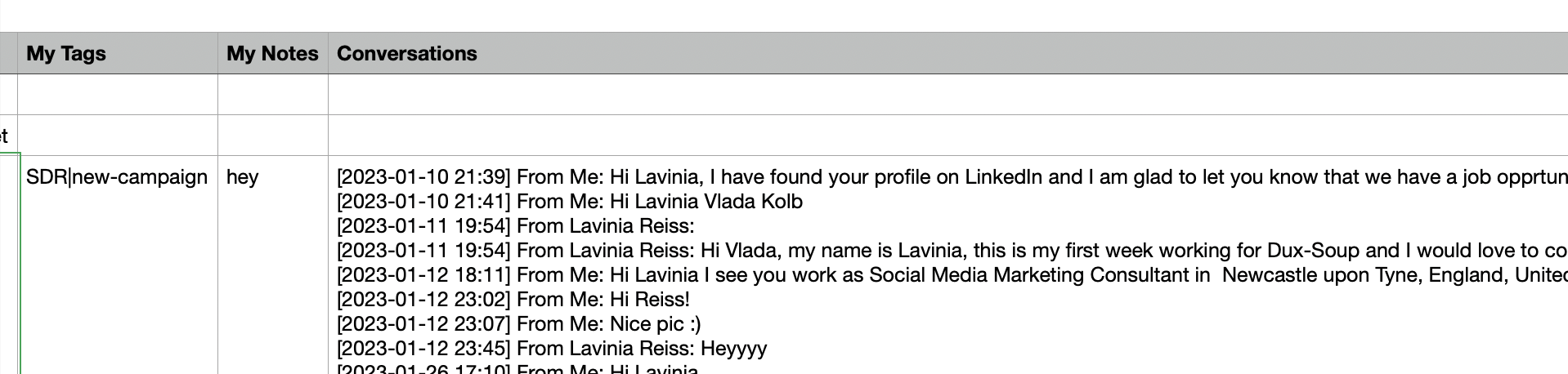 Dux-Soup can export LinkedIn conversation history for contacts created through manual visits, drip campaign actions, and auto-visits.