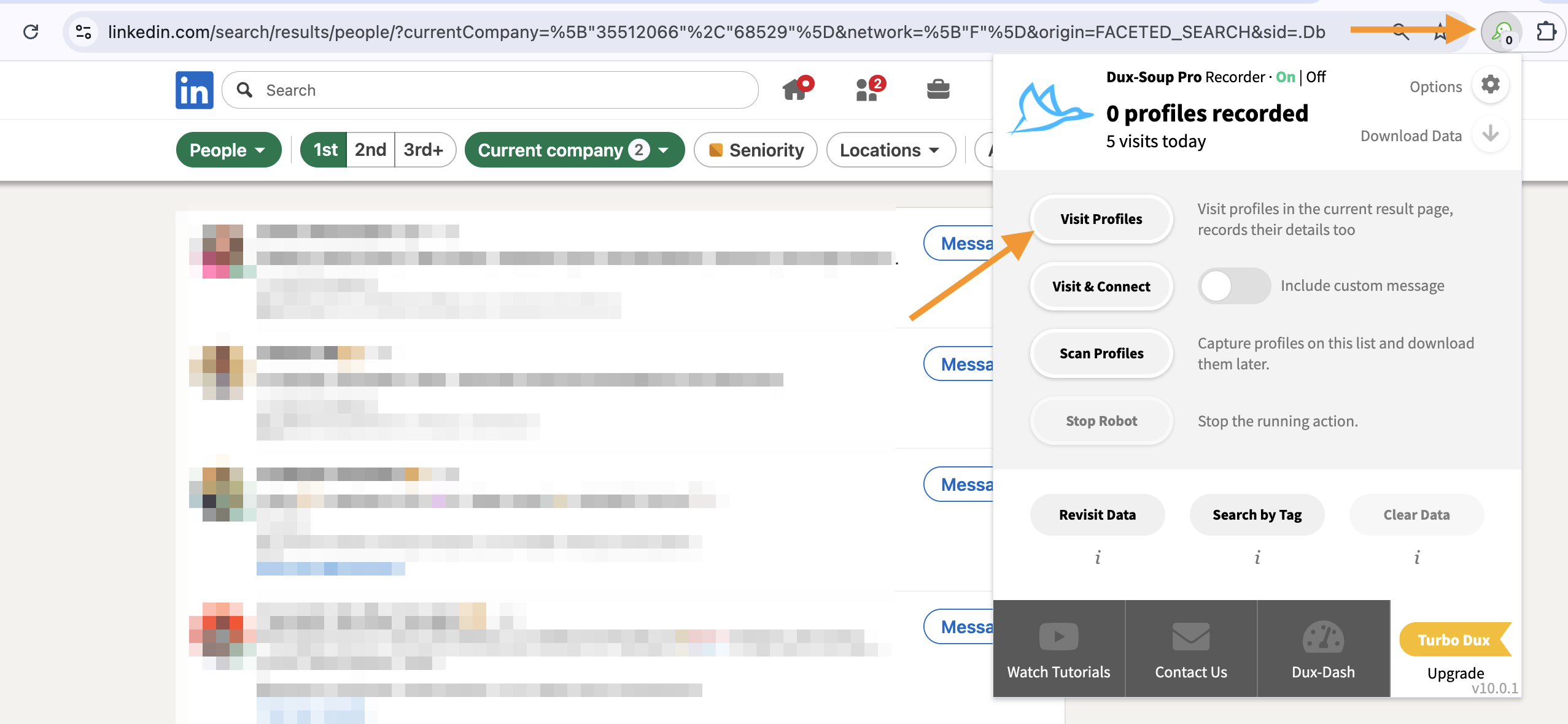 Once ready, click the Dux-Soup extension icon in the top-right corner of your browser and start the automation by clicking Visit Profiles.