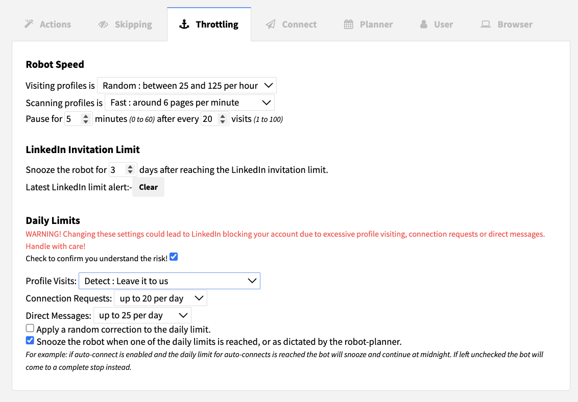 → Você pode ajustar ainda mais o comportamento da automação na guia Throttling (Limitação) dentro das Opções do Dux-Soup.