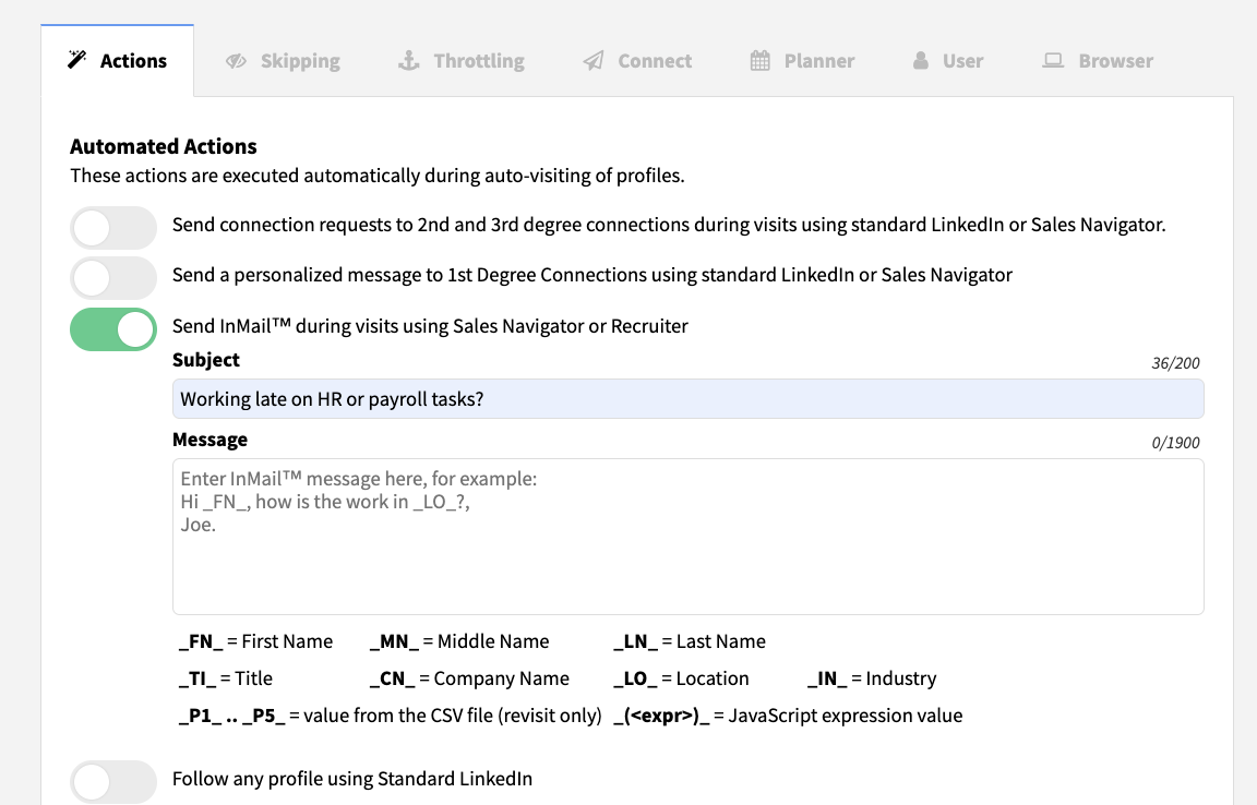 A opção InMail automatizada está disponível na interface do usuário Expert para usuários Pro e Turbo dentro da extensão (Opções → guia Ações). Além disso, usuários Turbo e Cloud podem adicionar uma ação InMail a uma sequência de campanha de gotejamento.