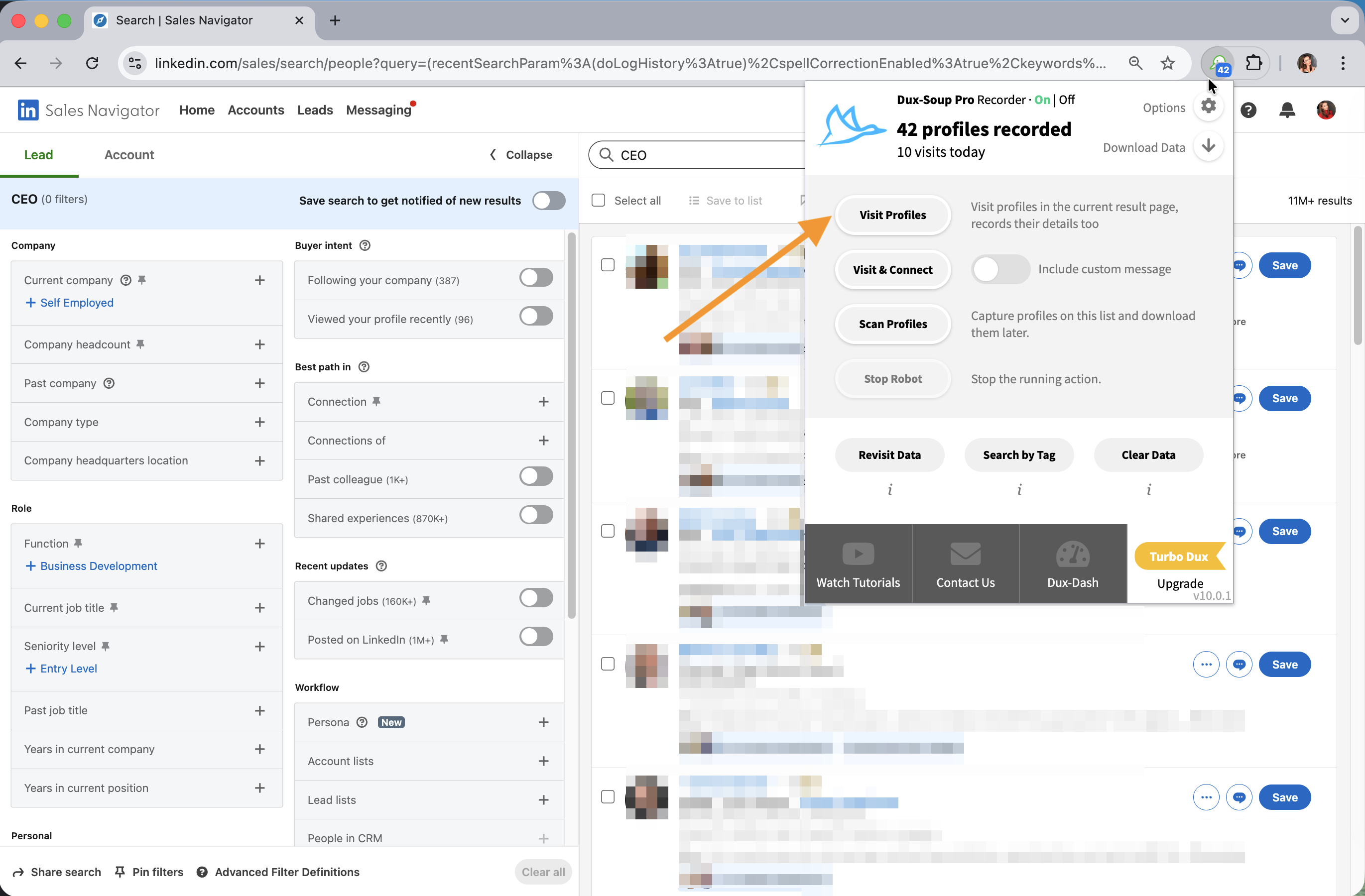 Em seguida, acesse oLinkedIne crie uma pesquisa de pessoas aplicando os filtros preferidos. Clique no ícone Dux-Soup e selecione Visitar perfis para começar a enviar InMails™.