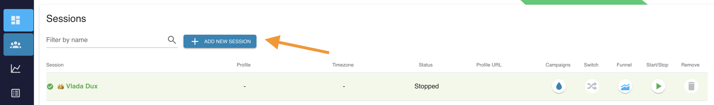 - Click on the "Add Session" button at the top of the profile page: