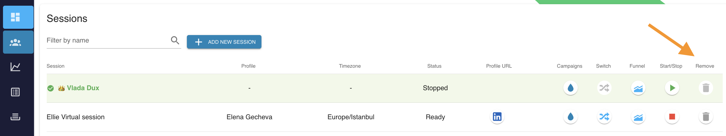 To add or remove a LinkedIn session, open User Dash via your Admin Profile Page.