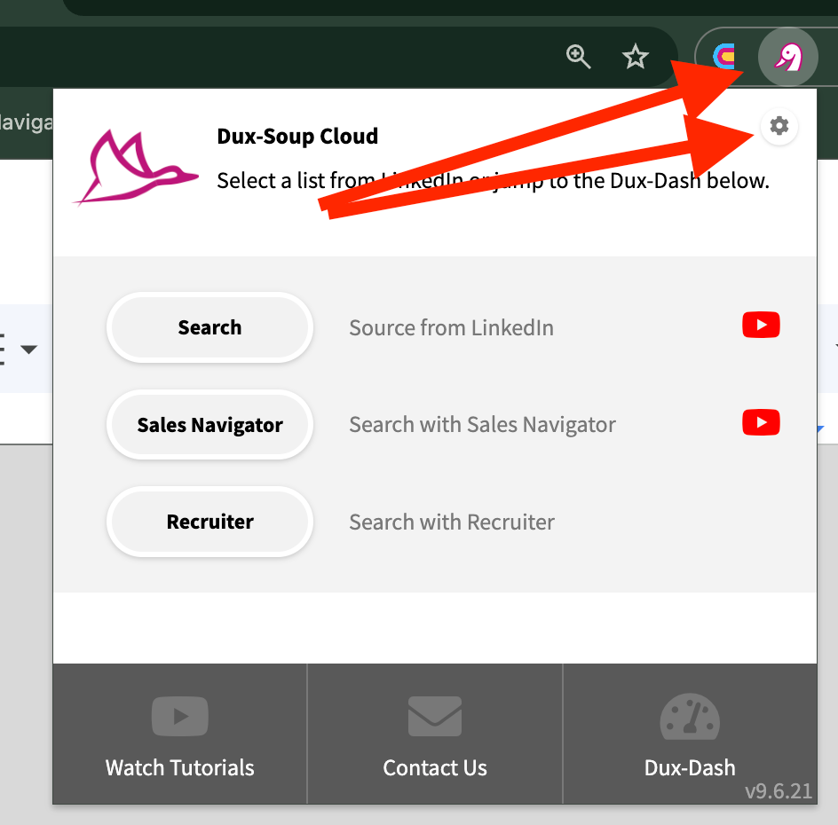 Klicken Sie auf die Dux-Soup-Erweiterung und dann auf das Zahnrad-Symbol.