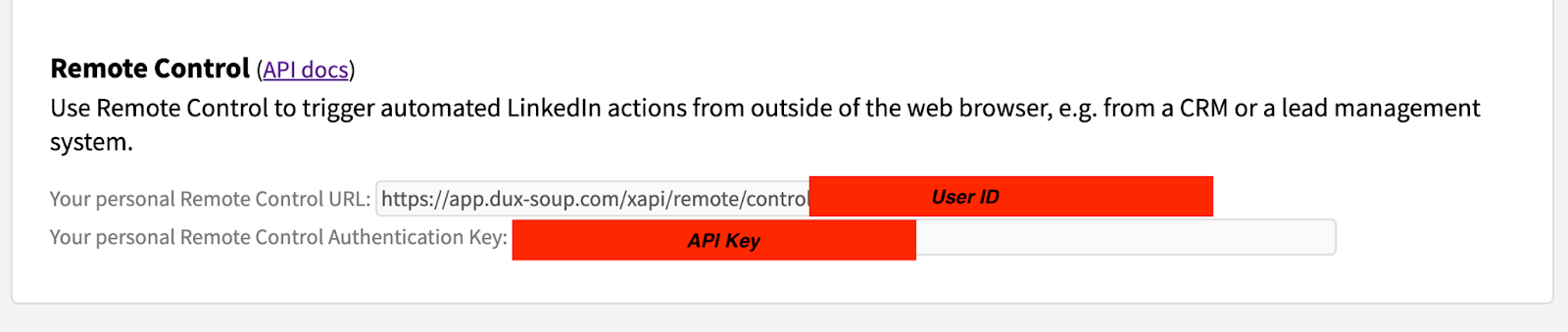 - Fügen Sie den API-Schlüssel ein, den Sie in Schritt 2 aus der Registerkarte „Dux-Soup Connect“ unter „Optionen“ kopiert haben. In der Regel handelt es sich dabei um eine Zeichenfolge aus Zahlen und Buchstaben.