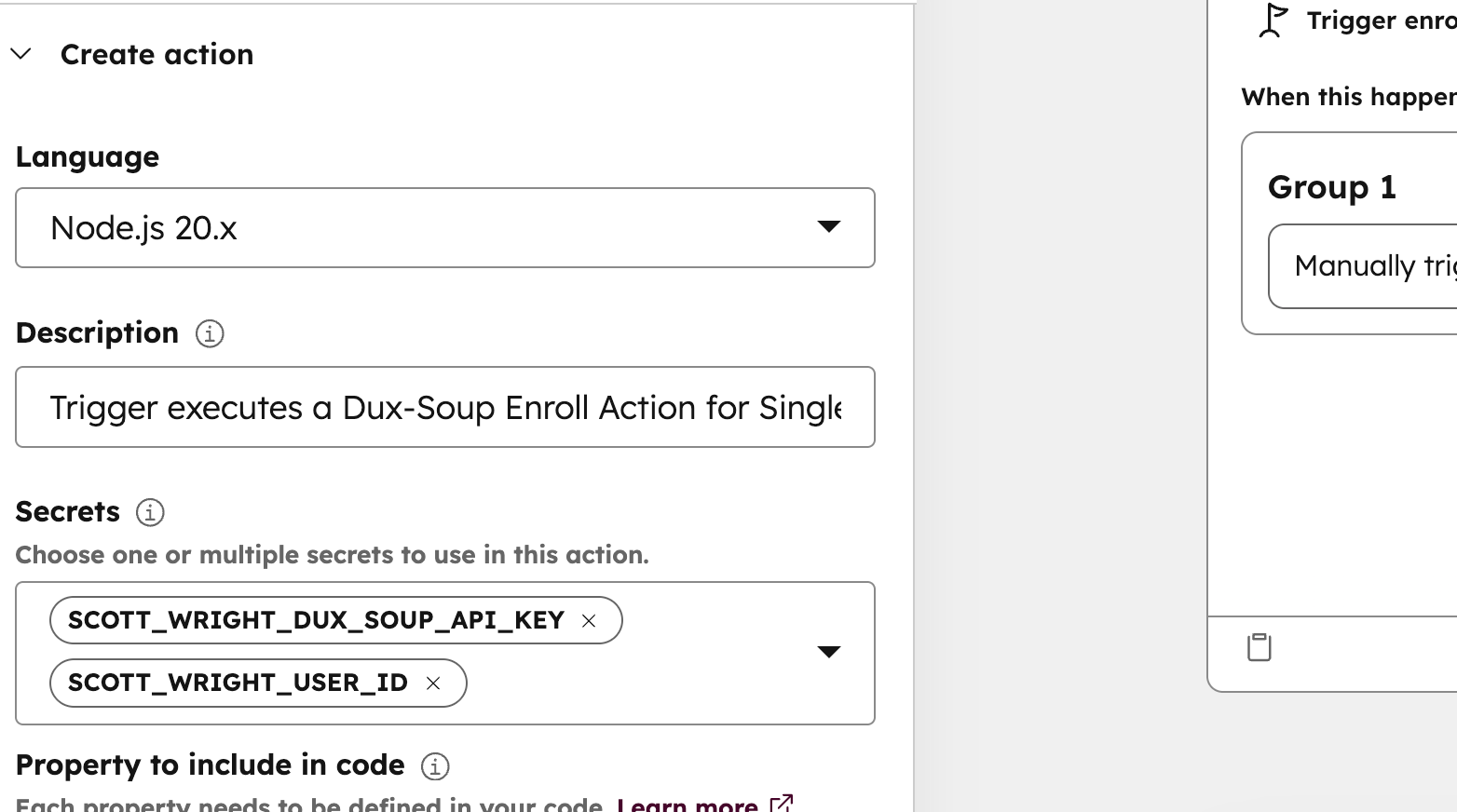 Dieses Tutorial führt Sie durch die Einrichtung eines HubSpot-Workflows, um automatisch eine Dux-Soup-Aktion „Enroll“ (Anmelden) für einen bestimmten Kontakt auszulösen. Dieser Prozess verwendet eine benutzerdefinierte Code-Aktion in HubSpot, um sicher mit der Dux-Soup-API zu kommunizieren.