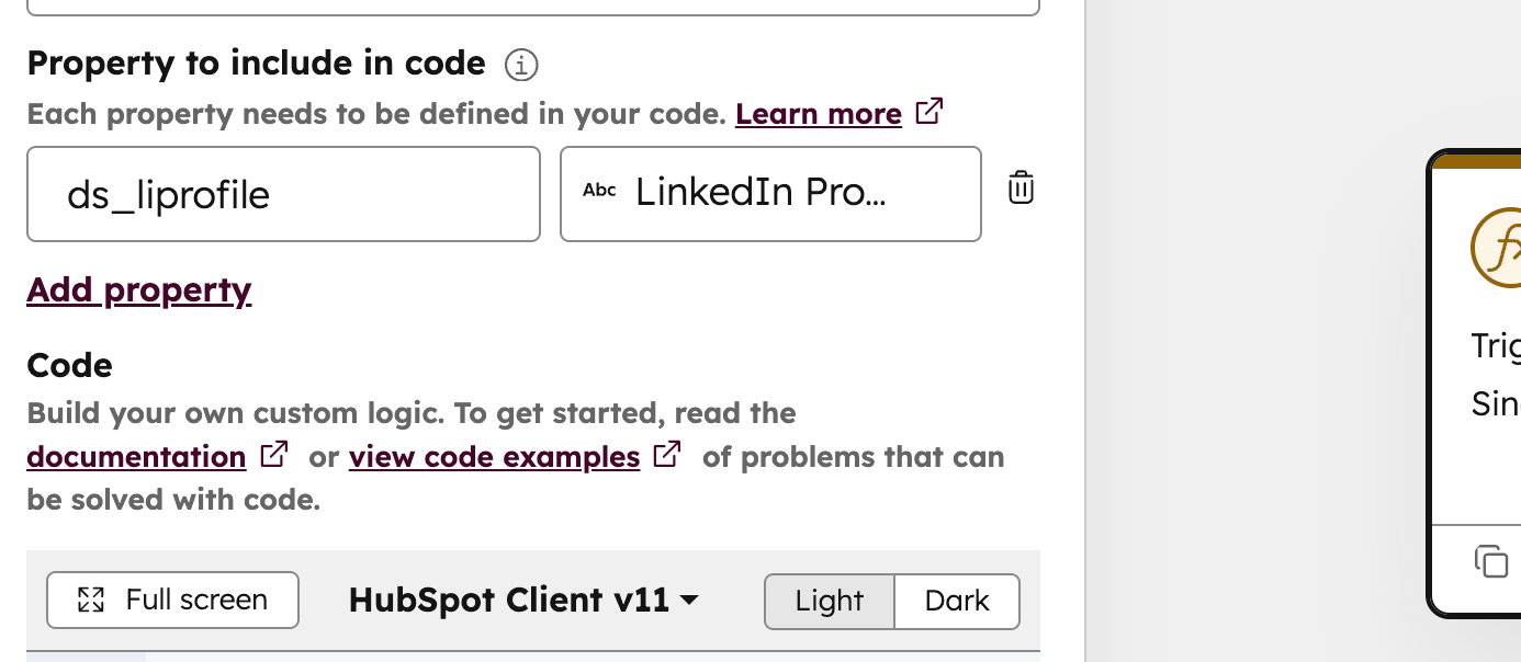 - Ordnen Sie die LinkedIn-Eigenschaft zu. Dadurch wird dem Code mitgeteilt, welches HubSpot-Feld die LinkedIn-URL des Kontakts enthält.